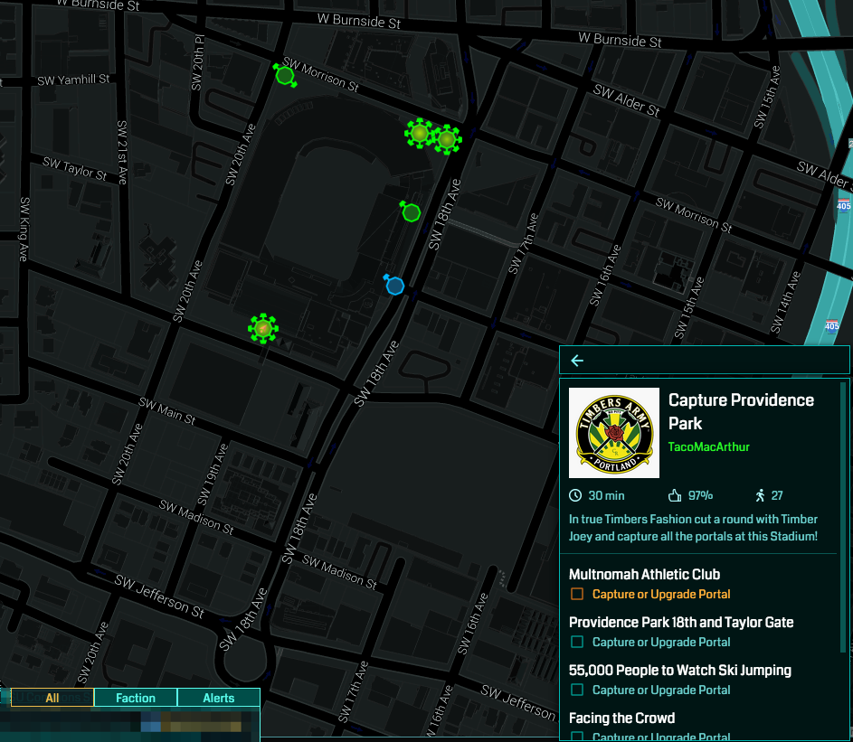 We were so excited to get the southern portal, Multnomah Athletic Club, because it was blue. All we had to do was upgrade it! No fighting! And the mission would be ours! But the problem was, it was high enough level already there was nothing for Amber to upgrade. I wouldn’t let this stand. So I used a Jarvis virus to turn it green — and we went back to XMPs. We took it down again and we both completed the mission.